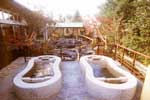 泉質:水道水加温 効能:筋肉痛・関節痛・間接のこわばり・疲労回復 3つ並んだ陶器のお風呂。三人娘が並んで入る。かわいい、楽しいお風呂です。